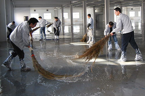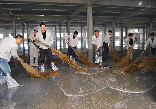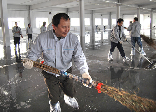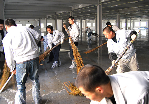東區(qū)新建廠房面積很大,浮土、雜物較多,這為清掃工作增加了難度,公司專門借調了消防車對廠房進行了全面沖刷,參加勞動的人員手持掃帚、拖布不停地清掃污水,汗水浸濕了衣衫,污水打濕了鞋面,弄臟了褲腿,但大家都奮力爭先,毫無怨言,經過近三個小時的勞動,寬敞的廠房清掃一新。在隨后幾天的畫線、貼膠帶、刷油漆工作中,大家冒著嚴寒的天氣,忍著刺鼻的油漆味,在地面上一蹲就是一二十分鐘,一絲不茍,毫不馬虎,人人都累得腰酸腿疼,有些人手掌打了泡,但沒有一個人叫苦叫累,為自己的新廠房多流一滴汗,多出一份力,是每個人的共同心愿。