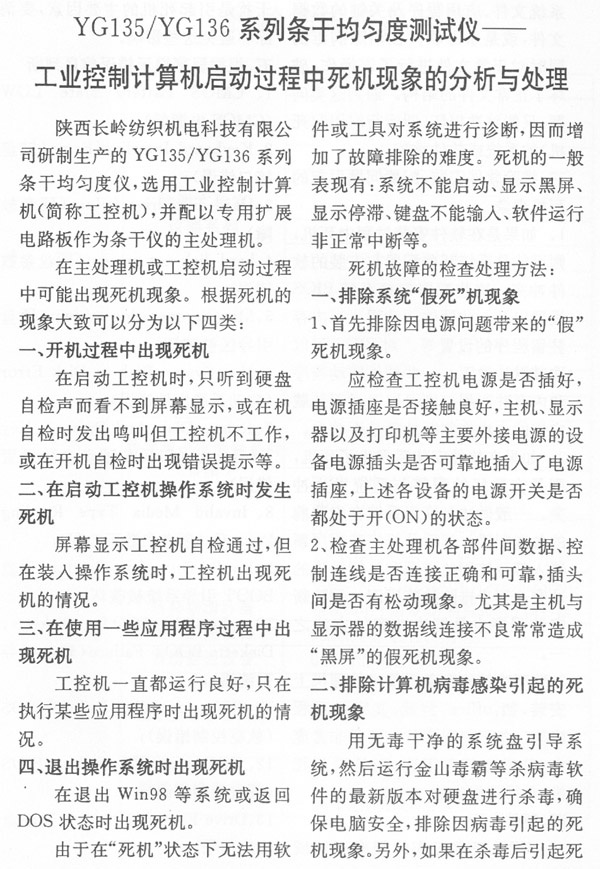 YG135/YG136系列條干均勻度測(cè)試儀——工業(yè)控制計(jì)算機(jī)啟動(dòng)過(guò)程中死機(jī)現(xiàn)象的分析與處理