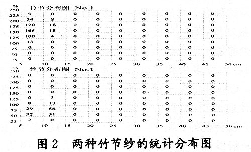 竹節(jié)間的這些差異必然影響到未來(lái)織物的風(fēng)格,精確控制竹節(jié)紗的各項(xiàng)指標(biāo)、隨時(shí)檢測(cè)竹節(jié)紗的質(zhì)量對(duì)于竹節(jié)紗生產(chǎn)廠家來(lái)說(shuō)是十分關(guān)鍵的。適應(yīng)竹節(jié)紗的質(zhì)量檢測(cè)要求,CT1000外觀分析儀中專門增加了針對(duì)竹節(jié)紗測(cè)試的竹節(jié)分布圖,可以按照竹節(jié)長(zhǎng)度和門限統(tǒng)計(jì)紗線中竹節(jié)的數(shù)量,幫助用戶分析竹節(jié)紗的質(zhì)量狀況,從而達(dá)到控制竹節(jié)紗的目的。