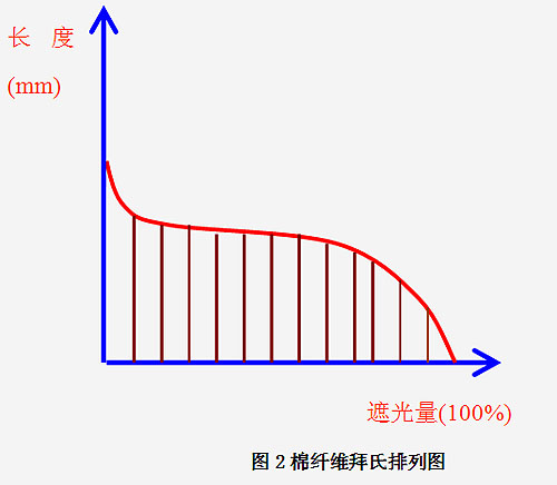 參照梳片法和羅拉法把纖維整理為一端整齊的原理,我們研制出了快速測量棉纖維短纖維含量的儀器,它的基本原理是:根據(jù)一端整齊的棉纖維由長到短的實際排列圖(見圖1)得到拜氏排列圖(見圖2),分別計算出跨距長度(3%Leff,50%Leff或其他任意設(shè)定的跨距長度)、有效長度Leff、重量短絨率(12.7mm重量短絨SFC(w)、16mm重量短絨SFC(w)-16mm)、 根數(shù)短絨率(12.7mm根數(shù)短絨SFC(n)、16mm根數(shù)短絨SFC(n)-16mm或其他任意長度的重量短絨和根數(shù)短絨等。