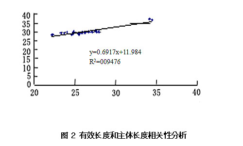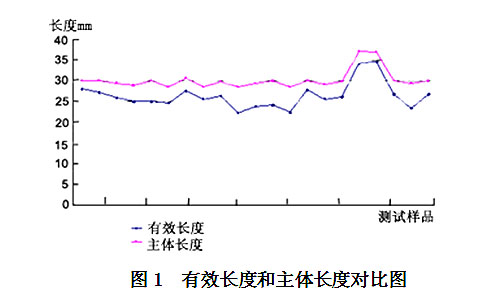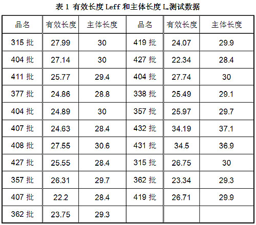 由于有效長(zhǎng)度Leff和主體長(zhǎng)度Lm的定義不同,所以測(cè)試結(jié)果也不完全相同,從圖1及圖2所做的相關(guān)性分析可以看出,二者具有良好的相關(guān)性。
