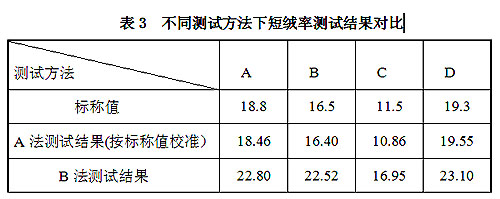 B法檢測(cè)過程中,因檢測(cè)人員的目光、手法,取樣量大小等人為因素而影響測(cè)試結(jié)果;而A法由于取樣量大代表性強(qiáng),所以具有一定的準(zhǔn)確性。表3是4種具有短絨標(biāo)稱值的棉花,用兩種方法的測(cè)試結(jié)果,可以看出,快速短絨測(cè)試儀的16mm重量短絨測(cè)試結(jié)果正確性較好。