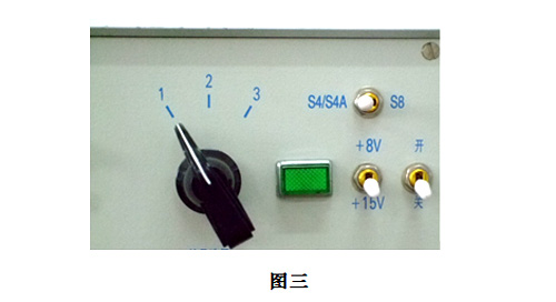 在進(jìn)行S30檢測(cè)頭維修前,將“S4/4A、S8轉(zhuǎn)換開(kāi)關(guān)”置于“S4/4A”位置,將“+8V、+15V 轉(zhuǎn)換開(kāi)關(guān)”置于“+15V” 位置,“錠號(hào)選擇”開(kāi)關(guān)置于“1”位置,如圖三所示: