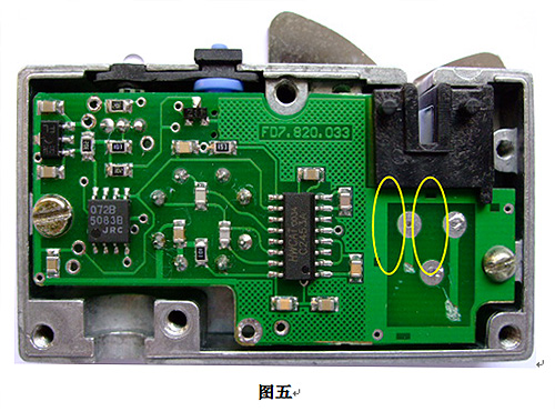 2.1.3 調(diào)整檢測(cè)頭零點(diǎn)的方法,是通過(guò)割檢測(cè)頭印制板上的印制線,見(jiàn)圖五圈中所示,割左邊的印制線會(huì)使零點(diǎn)朝正零點(diǎn)方向調(diào)整;割右邊的印制線會(huì)使零點(diǎn)朝負(fù)方向調(diào)整。