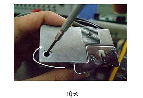 如圖六所示,調(diào)整孔中的靈敏度調(diào)整電位器大小可以使檢測(cè)頭的靈敏度增大或者減小。順時(shí)針旋轉(zhuǎn)靈敏度調(diào)整電位器使靈敏度增大,逆時(shí)針旋轉(zhuǎn)靈敏度調(diào)整電位器使靈敏度減小。假若這錠檢測(cè)頭是40mV,相差了20%,需要將靈敏度提高5~15mV??身槙r(shí)針旋轉(zhuǎn)靈敏度調(diào)整電位器,調(diào)整電位器后讀一下檢測(cè)頭零點(diǎn)在投絲前后的變化量(即靈敏度),若不在滿足范圍內(nèi)的話,就繼續(xù)調(diào)整電位器,直到該錠檢測(cè)頭的靈敏度與標(biāo)準(zhǔn)值相差在10%之內(nèi)。