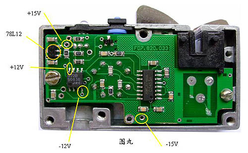 如果檢測(cè)頭的零點(diǎn)超過(guò)±5V范圍,就要檢查電源是否正常,檢測(cè)頭中有4路電源,分別為±15V、±12V,電源的位置如圖九所示。