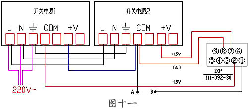 首先準(zhǔn)備兩塊15V的開(kāi)關(guān)電源及一些導(dǎo)線,以及圖一中的D型9針插座,型號(hào)為111-092-30,按下圖(圖十一)所示的方法接線。在圖十一中,開(kāi)關(guān)電源1提供-15V,開(kāi)關(guān)電源2提供+15V,開(kāi)關(guān)電源上的標(biāo)識(shí)“L”、“N”、“ ”表示該點(diǎn)接入交流220V的火線、零線和地線;“COM”表示開(kāi)關(guān)電源輸出直流電壓的地線,“+V”表示開(kāi)關(guān)電源輸出的直流電壓。在接線時(shí),將2個(gè)開(kāi)關(guān)電源的“L”、“N”、“ ”分別對(duì)應(yīng)連接,并將其中一只開(kāi)關(guān)電源的“L”、“N”、“ ”接入交流220V電源;將開(kāi)關(guān)電源1的“+V”與開(kāi)關(guān)電源2的“COM”連接,這時(shí)開(kāi)關(guān)電源1的“COM”即輸出-15V電壓,開(kāi)關(guān)電源2的“+V”輸出+15V電壓,“COM”為±15 V電源的地線。將開(kāi)關(guān)電源1的“COM”接入D型9點(diǎn)插座的2腳,開(kāi)關(guān)電源2的“+V”接入插座的7腳,開(kāi)關(guān)電源2的“COM”接入插座的8腳,這時(shí)這個(gè)簡(jiǎn)易的S30檢測(cè)頭檢查、維修裝置就制作完成了。D型9點(diǎn)插座的1腳為檢測(cè)頭的零點(diǎn)輸出,我們可以在插座的1腳上焊出來(lái)一根導(dǎo)線方便使用三用表測(cè)試,在圖十一中將檢測(cè)頭接插在插座“1XP”上,“A”點(diǎn)接三用表的黑表筆,“B”點(diǎn)接紅表筆,即可測(cè)得檢測(cè)頭的零點(diǎn),繼而可對(duì)檢測(cè)頭進(jìn)行零點(diǎn)、靈敏度和清零按鈕等項(xiàng)目的檢查。