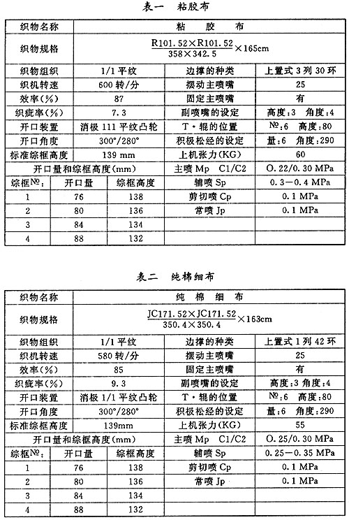 在CA082噴氣織機生產(chǎn)運行中,試驗織造了多個品種,現(xiàn)列出組織測試的4個織物品種,附織物品種及簡明織造工藝: