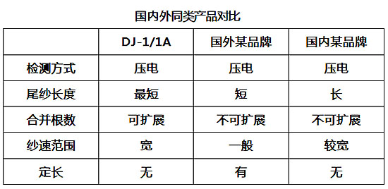 目前,國外較先進(jìn)的并紗機(jī)斷紗檢測器的主要優(yōu)點(diǎn)是:壓電式測量,采用微處理技術(shù),性能好,可靠性高,并紗支數(shù)可達(dá)120Nec,分級處理,但價(jià)格昂貴。國產(chǎn)壓電式斷紗檢測器,處理器采用數(shù)字式硬件方式,最高并紗支數(shù)可達(dá)134Nec,但可靠性低,并紗根數(shù)錠數(shù)配置固定,不易擴(kuò)展。長嶺紡電DJ-1/1A斷紗檢測器的主要性能指標(biāo)均處于優(yōu)先水平,某些項(xiàng)目 達(dá)到或超過了國際先進(jìn)水平。 下表列出了國內(nèi)外的斷紗檢測器對比情況。