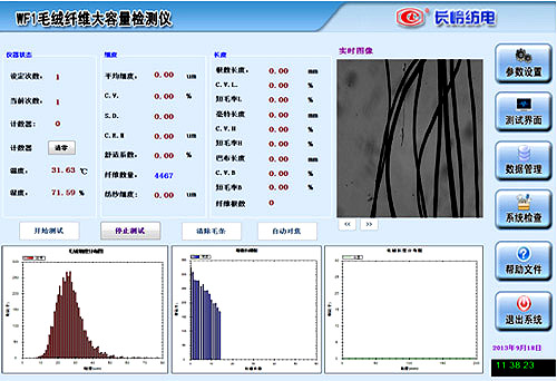 長度和細度指標是表征羊毛等毛絨纖維物理性能的重要指標,對毛紡生產(chǎn)過程和產(chǎn)品質(zhì)量影響很大。目前國內(nèi)測量毛絨纖維長度的方法主要為梳片法,它只能測量出巴布長度和間接毫特長度等指標,且試驗時間長,計算工作量大;測量細度的儀器主要是投影顯微鏡,盡管這幾年來此類產(chǎn)品的精度和自動化程度有所提高,但測試效率還仍然偏低。長嶺WF1毛絨纖維大容量檢測儀采用光學(xué)圖像分析法,可以同時測量毛絨纖維的長度和細度指標,并且能同時給出根數(shù)長度、毫特長度、巴布長度等各項長度指標,尤其是根數(shù)加權(quán)長度指標的快速測試,由于使用的是光學(xué)鏡頭配合數(shù)字相機,所以其測量結(jié)果精確,測試效率很高??梢宰鳛槊q纖維質(zhì)量快速檢測與評價的儀器。