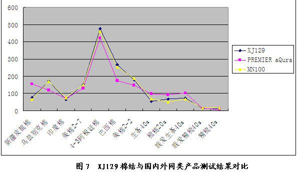 由下圖表可以看出,XJ129棉結(jié)測試數(shù)據(jù)與aQura、MN100(烏斯特)測試數(shù)據(jù)相當(dāng),與MN100(烏斯特)測試數(shù)據(jù)的相關(guān)性更好;XJ129短絨測試結(jié)果和手工測試結(jié)果基本一致;XJ129有效長度指標(biāo)和aQura有效長度測試數(shù)據(jù)基本一致。