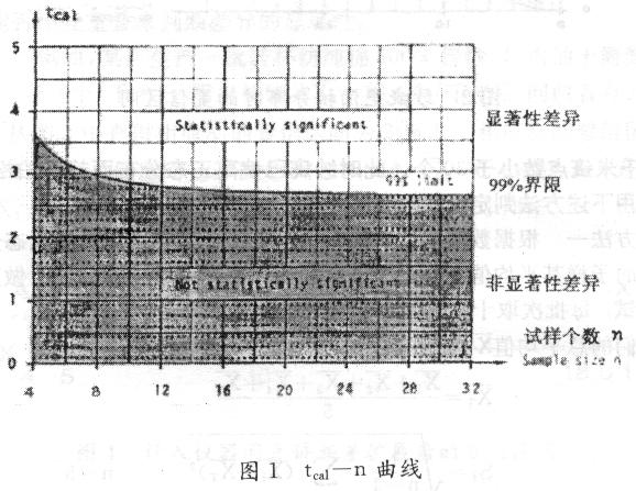 查圖1所給的tcal—n曲線,相應式樣個數(shù)n=10時分界線上的t值為2.8 (可信度99%),現(xiàn)計算所得的tcal<2.8即位于陰影區(qū)內(nèi),說明上述對千米棉結數(shù)的兩測試結果不存在顯著性差異。
