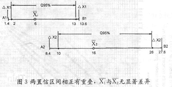 顯然此時的置信區(qū)間對均值而言是不對稱的。A1B1與A2B2兩線段能夠相互重疊,可判定上述兩測試結果X1與X2沒有顯著差異。