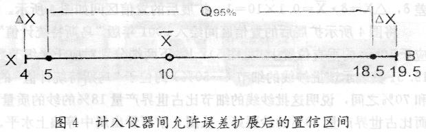 從圖2中查得相應X的置信區(qū)間為5至18.5;再計入儀器間允許誤差δ,△X=δ•X =0.1×10=1,擴展后的置信區(qū)間如圖4所示。
