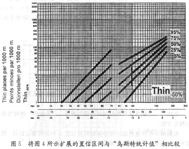將圖4所示擴展后的置信區(qū)間繪入2001年版“烏斯特統(tǒng)計值”中相應于10tex的垂直位置上(見圖5),上、下兩端分別對應千米細節(jié)數(shù)4及19.5。其表示該批紗線的細節(jié)(-50%)約位于“烏斯特統(tǒng)計值”的18%和70%之間,說明這批紗線的細節(jié)比占世界產(chǎn)量18%的紗的質量為差,而比占世界產(chǎn)量30%的紗要好,從圖5中可看出屬中等偏上水平。